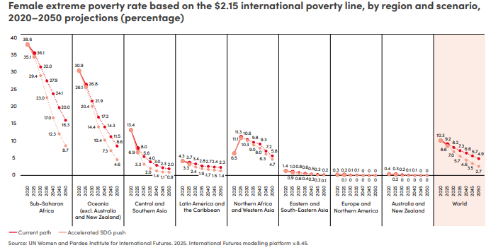Female extreme poverty has barely shifted in recent years, hovering around 10% since 2020. If trends continue, 8.2% of women and girls will remain in extreme poverty by 2030. By contrast, accelerating SDG implementation could cut female extreme poverty from 9.2% in 2025 to just 2.7% by 2050.